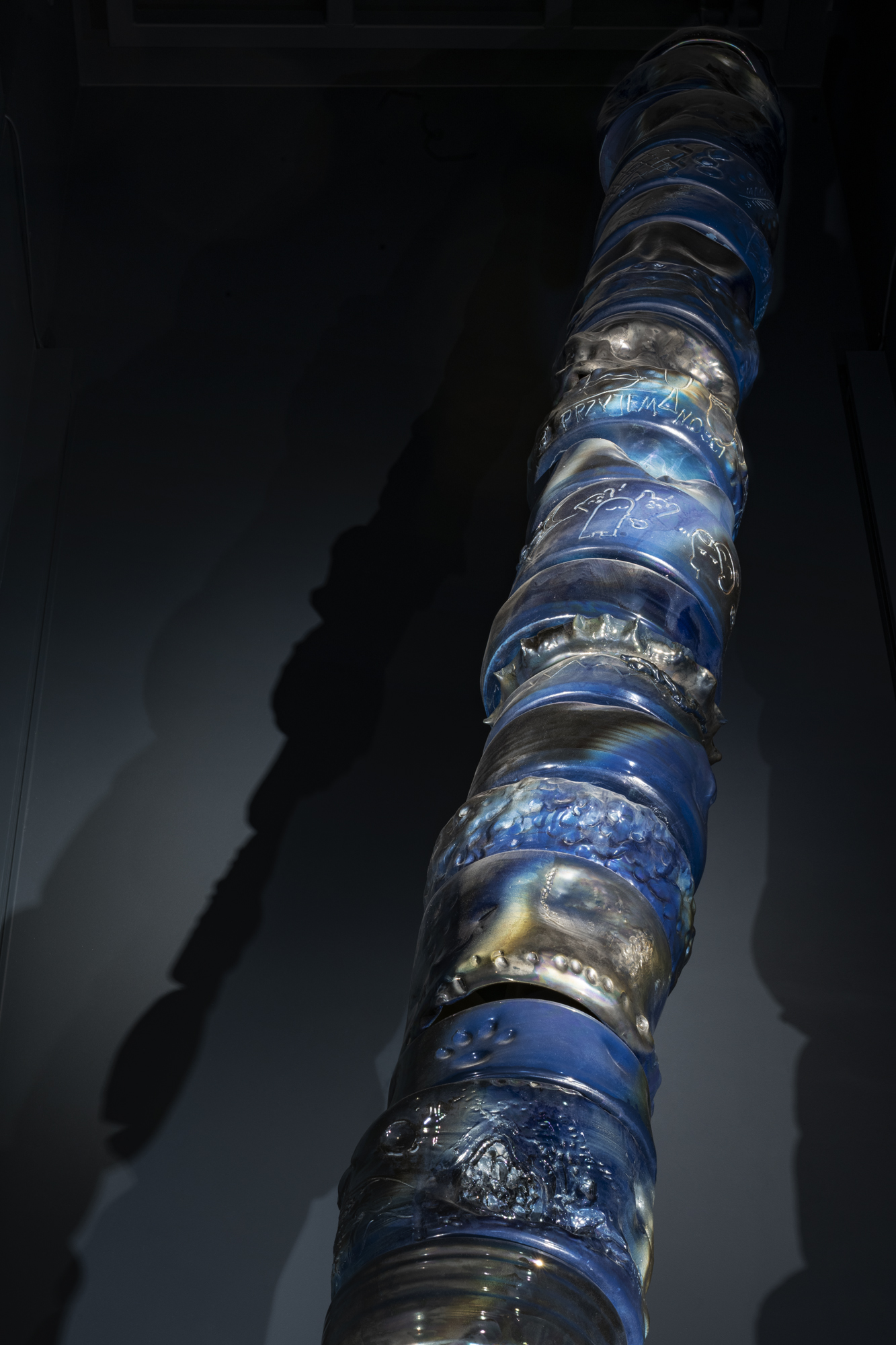 2025, instalacja, tkanina barwiona naturalnymi pigmentami z ziemniaków, ręcznie malowana farbą z naturalnych pigmentów i żywicy akacjowej, 235 x 225 cm, drewniana obręcz Ø 100 cm